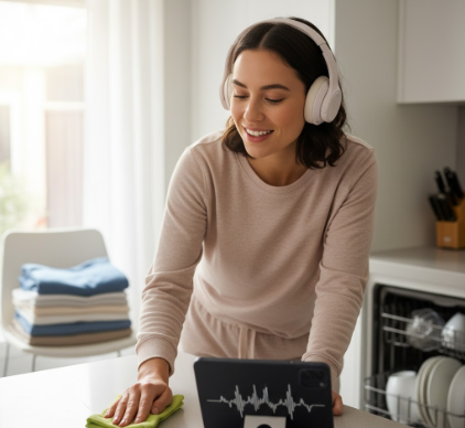 You don’t need fancy equipment. A smartphone and a decent pair of headphones or earbuds are usually all it takes. Wireless earbuds are particularly convenient, offering freedom of movement without getting tangled in cords while you vacuum or reach high shelves. If you’re working in one room for a while, a small Bluetooth speaker can also work well, filling the space with sound.
